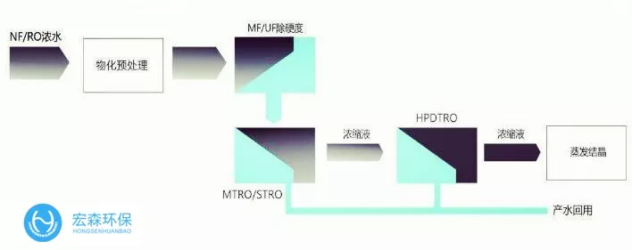 宏森作為一家專注于膜工藝處理垃圾滲濾液的成熟的企業(yè),擁有豐富的DTRO膜應用經(jīng)驗,擁有超過60個DTRO項目業(yè)績,經(jīng)過與多家滲濾液工程公司和設計院聯(lián)合開發(fā),成功驗證并實施了使用DTRO膜技術對NF-RO進行減量化的工藝。該工藝簡單可靠,無需預處理,不產(chǎn)生無極污泥。