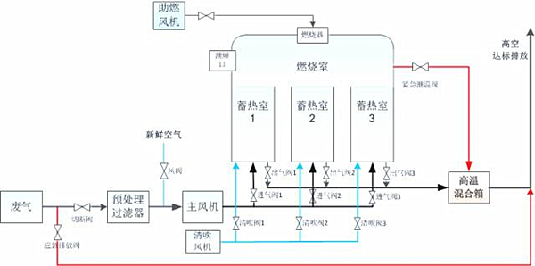 有機廢氣通過風機輸入蓄熱室進行升溫,吸收儲存的熱量,隨后進入焚燒室進行燃燒,在燃燒的過程中,有機廢氣被分解成二氧化碳和水。而且,有機廢氣在燃燒的時候,所釋放的能量,還可以被蓄熱室里的廢氣利用,達到節能的目的。